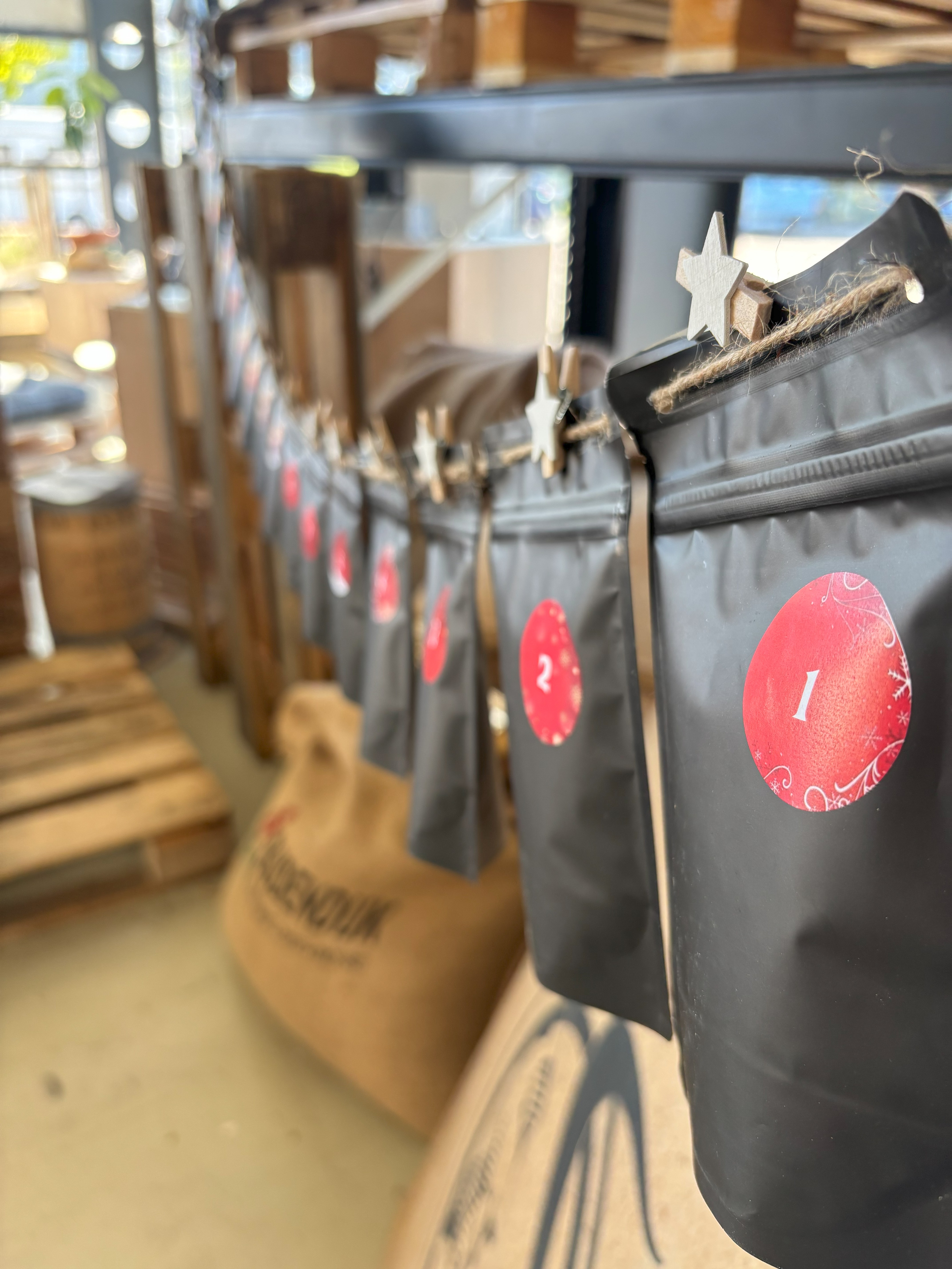 20x 50g Kaffeebohnen, 1x Schokoespressobohnen, 1x Trinkschokolade, 1x Kaffeeklammer, inkl. 2 x kleine Überraschungen